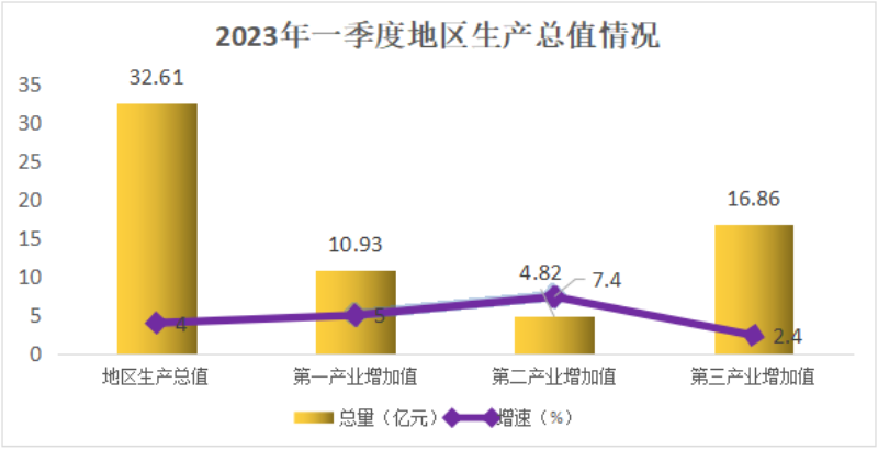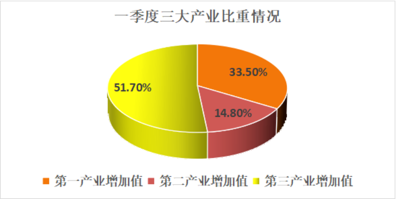 根據地區生產總值統一核算結果,一季度我縣實現地區生產總值32.61億元,同比增長4%,比上年同期回升了3個百分點。分產業看,第一產業增加值10.93億元,增長5%;第二產業增加值4.82億元,增長7.4%;第三產業增加值16.86億元,增長2.4%。三大產業比例:33.5:14.8:51.7。