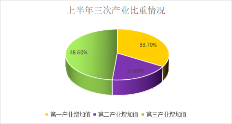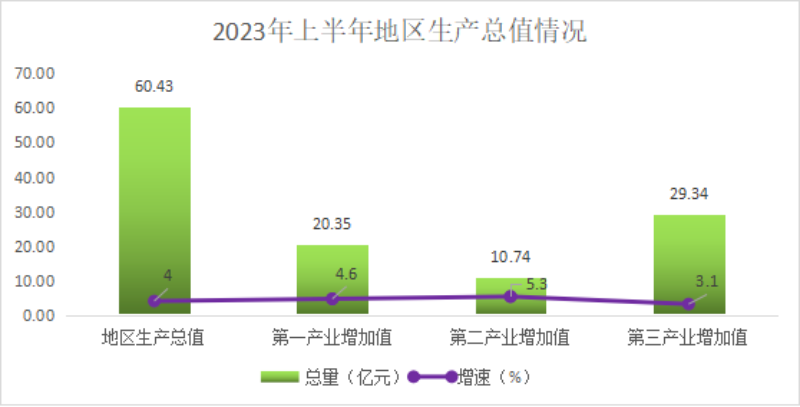 根據地區生產總值統一核算結果,上半年實現地區生產總值60.43億元,同比增長4%,比上年同期回升了38個百分點,比全市增速高0.4個百分點,其中第一產業增加值20.35億元,增長4.6%;第二產業增加值10.74億元,增長5.3%;第三產業增加值29.34億元,增長3.1%。三大產業比例:33.7:17.8:48.6。