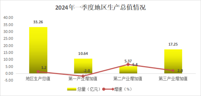 根據地區生產總值統一核算結果,一季度全縣實現地區生產總值33.26億元,同比增長1.2%。分產業看,第一產業增加值10.64億元,下降2%;第二產業增加值5.37億元,增長6.4%;第三產業增加值17.25億元,增長2%;三大產業比例:32:16.1:51.9。
