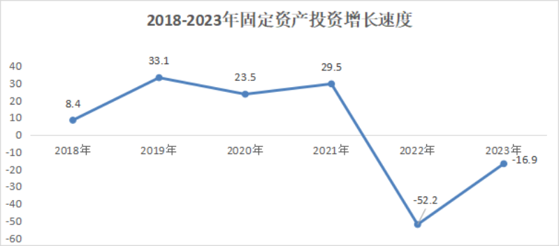 全年固定資產投資總額比上年下降16.9%,分行業看,第一產業投資下降93.7%;第二產業投資增長109.8%;第三產業投資下降52.6%。分類型看,建筑安裝投資下降57.9%;基礎設施投資增長9.8%;房地產開發投資下降26%。
