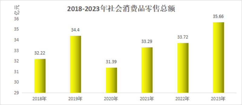 全年實現社會消費品零售總額35.66億元,增長6.3%,其中,限額以上零售額2.05億元,下降5.8%;限額以下零售額33.61億元,增長6.7%。