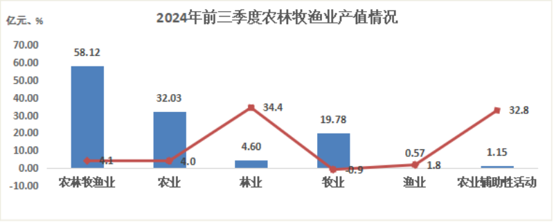 一、農(nóng)林牧漁業(yè)加快發(fā)展。前三季度,全縣農(nóng)林牧漁業(yè)總產(chǎn)值58.12億元,同比增長4.1%,比上半年加快3.7個百分點。分行業(yè)看,農(nóng)業(yè)產(chǎn)值32.03億元,增長4%;林業(yè)產(chǎn)值4.6億元,增長34.4%;牧業(yè)產(chǎn)值19.78億元,下降0.9%;漁業(yè)產(chǎn)值0.57億元,增長1.8%;農(nóng)林牧漁專業(yè)及輔助性活動產(chǎn)值1.15億元,增長32.8%。