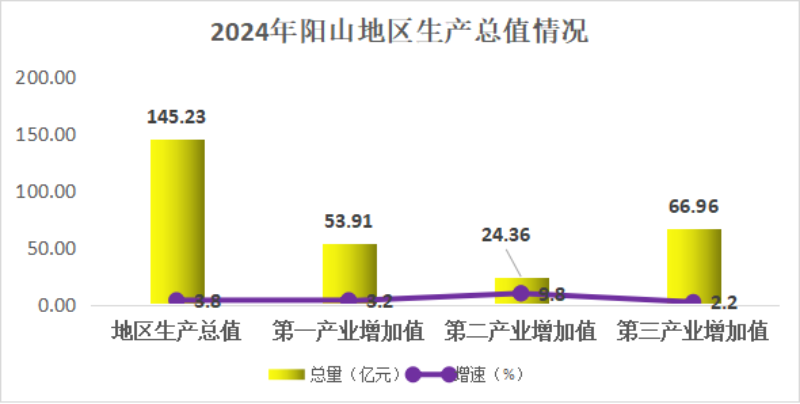 根據(jù)清遠(yuǎn)市地區(qū)生產(chǎn)總值統(tǒng)一核算結(jié)果,2024年,我縣地區(qū)生產(chǎn)總值145.23億元,按不變價(jià)格計(jì)算,同比增長(zhǎng)3.8%。其中,第一產(chǎn)業(yè)增加值53.91億元,同比增長(zhǎng)3.2%;第二產(chǎn)業(yè)增加值24.36億元,同比增長(zhǎng)9.8%;第三產(chǎn)業(yè)增加值66.96億元,同比增長(zhǎng)2.2%。