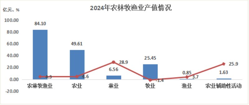 一、農(nóng)林牧漁業(yè)加快發(fā)展。2024年,全縣農(nóng)林牧漁業(yè)總產(chǎn)值84.1億元,同比增長(zhǎng)4.3%,比前三季度加快0.2個(gè)百分點(diǎn)。分行業(yè)看,農(nóng)業(yè)產(chǎn)值49.61億元,增長(zhǎng)4.6%;林業(yè)產(chǎn)值6.56億元,增長(zhǎng)28.9%;牧業(yè)產(chǎn)值25.45億元,下降1.4%;漁業(yè)產(chǎn)值0.85億元,增長(zhǎng)3.7%;農(nóng)林牧漁專業(yè)及輔助性活動(dòng)產(chǎn)值1.63億元,增長(zhǎng)25.9%。