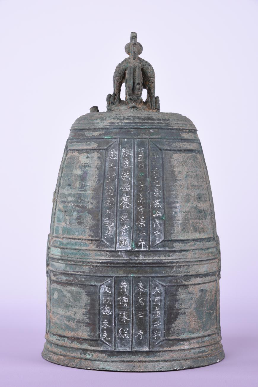 銅鐘呈圓錐形,弧腹,腹部微鼓,向下往外稍敞,口部較平;腹部向上肩部漸收,平頂;肩部和口部各飾三道凸弦紋,腹部飾五道凸弦紋,四向分別飾有五道凸豎向線條,并與上、中、下弦紋相連接,把銅鐘劃分為八個長方形,豎線行間刻有四行銘文:“維天寶七載,歲次戊子六月庚子朔廿五日甲子,弟子蔡公寂奉為亡考敬造洪鐘,賽還前愿。并僧陳紹恩乞疏得銅入鐘,共成功德。永充”。