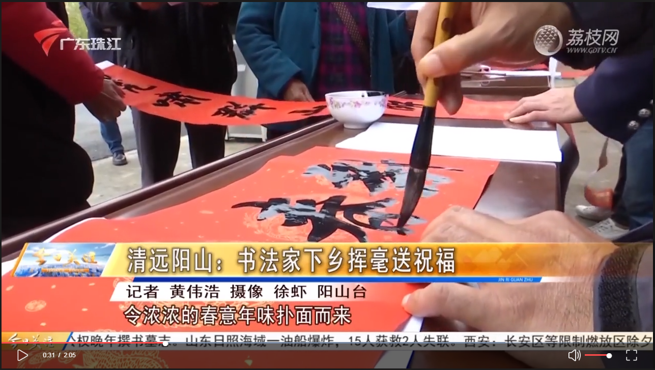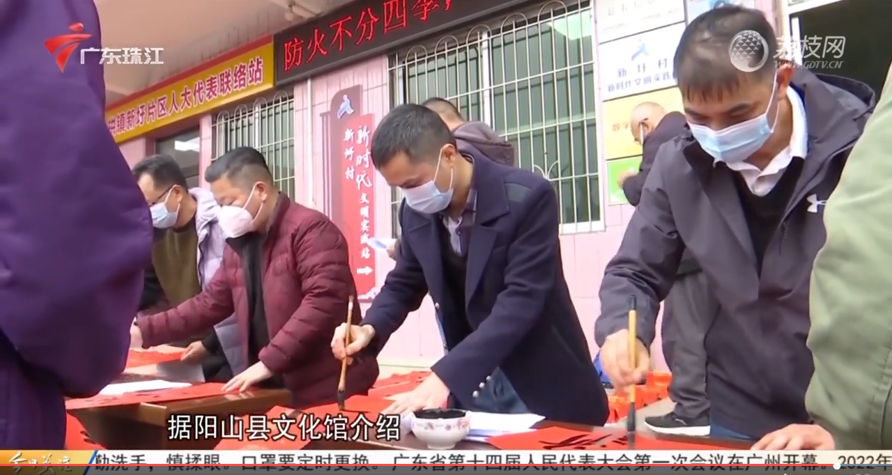 在春節來臨之際,2023年1月10日,陽山縣文化館協助廣東廣播電視臺“今日關注”欄目和陽山縣融媒體中心組織縣美術家協會會員到陽山縣七拱鎮新圩村舉辦“書法家下鄉揮毫送祝福”活動,為鄉親免費義寫春聯。1月12日,該新聞報道在廣東廣播電視臺珠江頻道“今日關注”欄目進行播出。