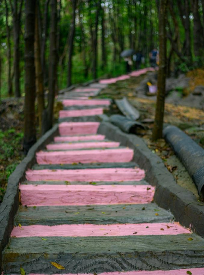 磨刀坑這邊有非常醒目的粉色階梯,一路往上是樹木成林,遮天蔽日,喜歡尋找寧靜的小伙伴可以挑戰一下雖然階梯有防滑處理,但登階時還是要注意安全哦。