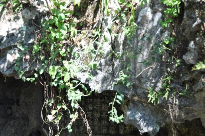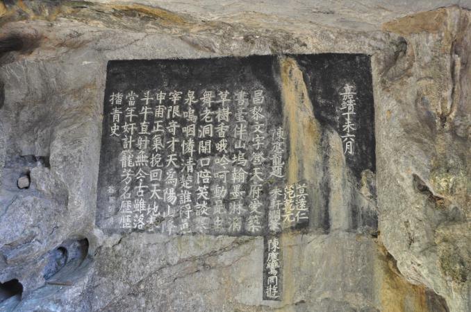 水簾洞的不遠(yuǎn)處是著名的打字巖,上有韓愈“鳶飛魚躍”的草書題刻,字字筆力遒勁,極為珍貴,旁邊還有宋紹熙元年(1190)陽(yáng)山令張本中的楷書“皇宋圣傳頌詩(shī)并序”,全文共396字,每字古勁遒秀,是廣東杰出的宋刻。