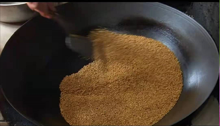 傳統黃坌秋餅一般選用糯米、粘米、紅糖、花生仁、芝麻等上等食材作為原材料。以前用石磨手工磨粉,現在圖方便普遍都用機器打磨,磨好的炒米粉一般要晾放一天半天才用來做餅,這樣不容易上火。