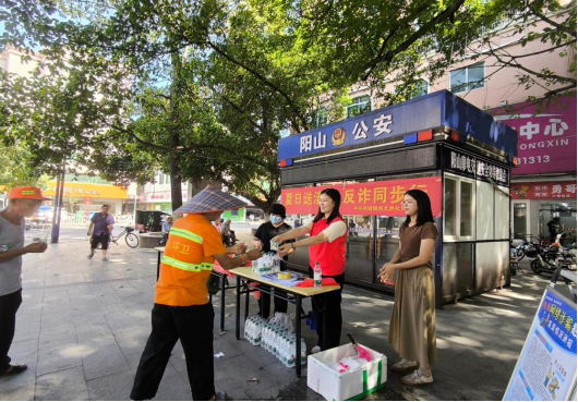 活動現場,志愿者們為社區環衛工人、快遞騎手送上礦泉水、西瓜等防暑降溫物資,并向他們宣傳防暑降溫相關知識,囑咐他們在高溫天氣下要做好個人防暑措施,注意休息、勞逸結合,保證自身健康和勞動安全。