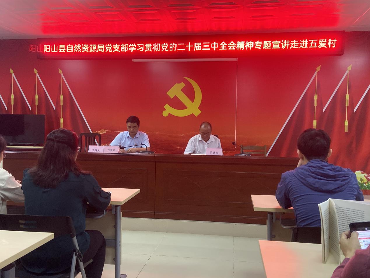 為深入學習領會黨的二十屆三中全會精神,引導黨員干部把思想和行動統一到全會精神上來,切實把學習成效轉化為推動工作的強大力量。9月24日,自然資源局黨組書記、局長許渝堯帶領黨員干部前往五愛村開展學習貫徹黨的二十屆三中全會精神專題宣講,五愛村黨總支書記梁盛彬及部分黨員群眾參加了宣講活動。