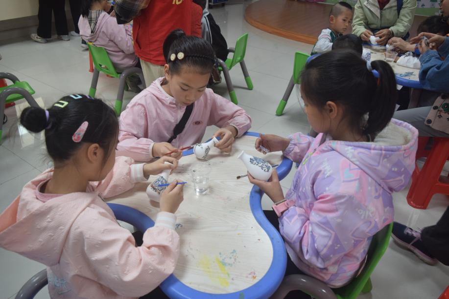 在活動的現場,孩子們聽完文文老師講解青花瓷器水拓印的傳奇故事,眼中閃爍著躍躍欲試的光芒。他們拿起顏料筆,蘸上顏料,像小小藝術家一樣,在瓷器上揮灑自如。每一劃,都是對非遺技藝的致敬;每一筆,都蘊含著對傳統文化的探索。通過這次實踐,孩子們不僅掌握了水拓印的秘訣,更深刻領悟到了傳統文化的深厚底蘊與無限魅力。