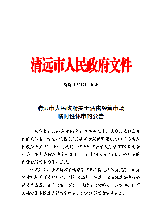 清遠市人民政府關于活禽經營市場臨時性休市的公告