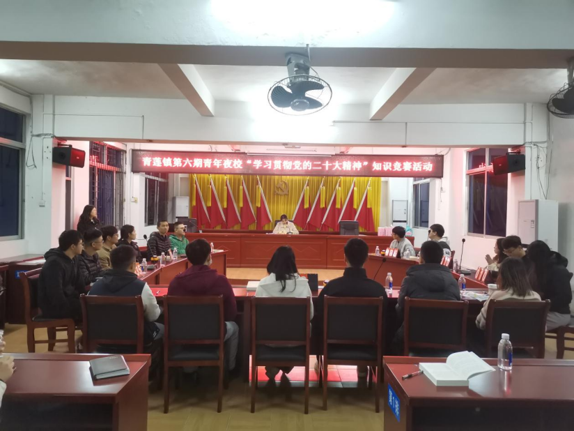 為進一步深入學習貫徹黨的二十大精神,培養一支懷抱夢想又腳踏實地,敢想敢為又善作善成的青年干部隊伍,助力“百千萬”工程,賦能青蓮高質量發展,12月4日晚上,青蓮鎮舉辦第六期青年夜校“學習貫徹黨的二十大精神”知識競賽活動。活動由鎮黨委委員伍潔瓊主持,全鎮30多名青年干部參加。